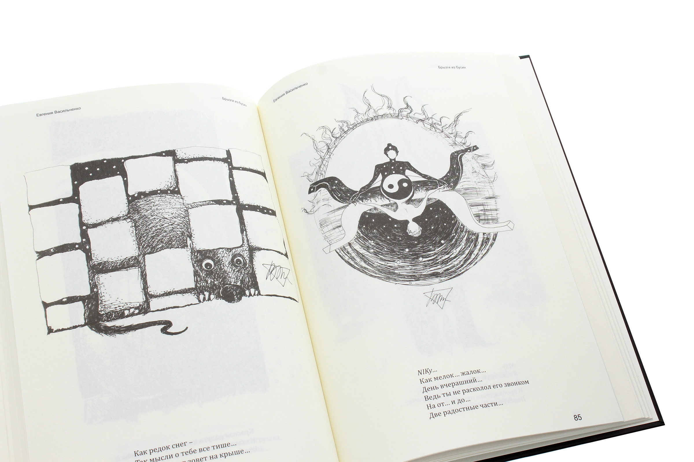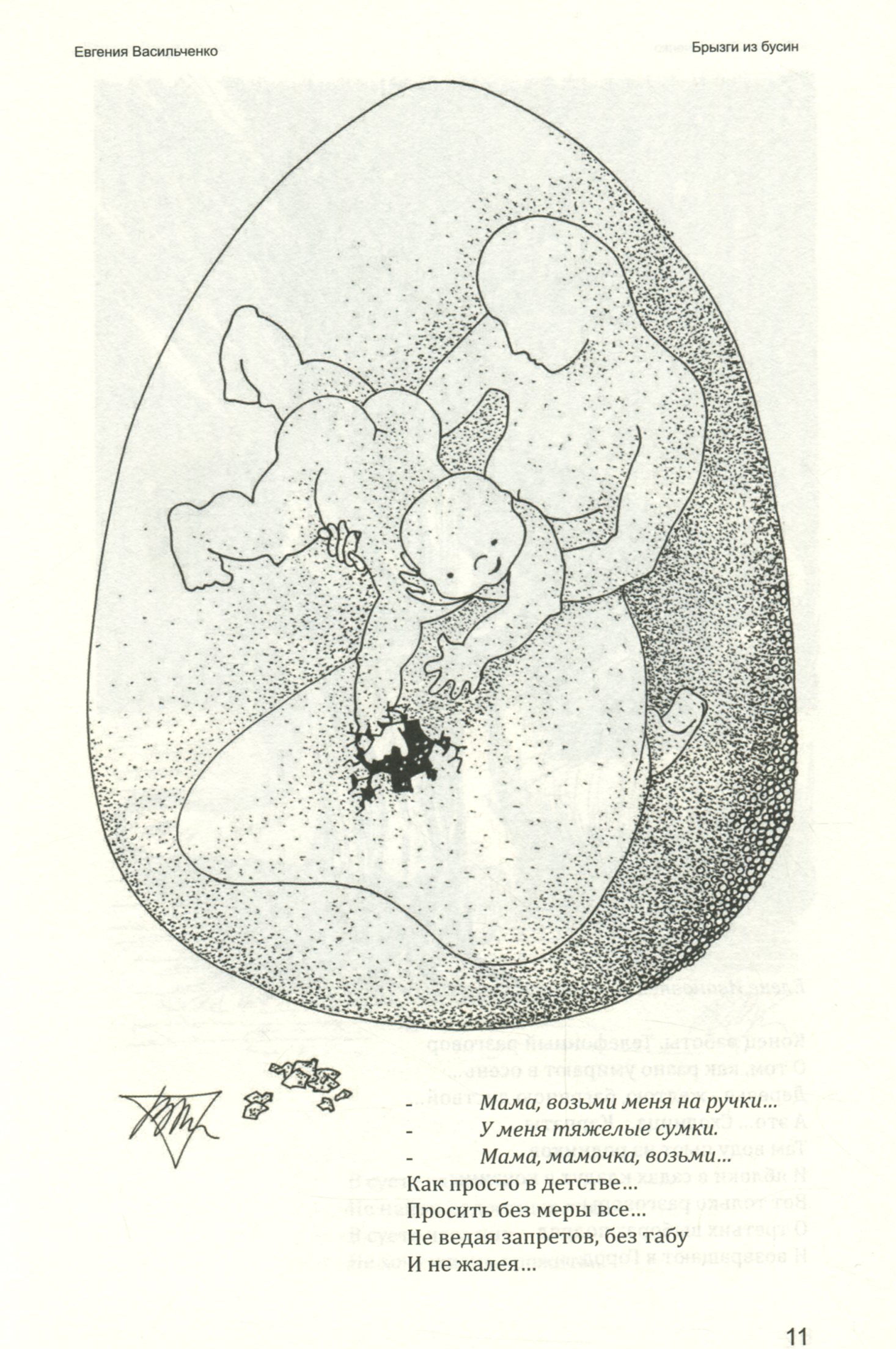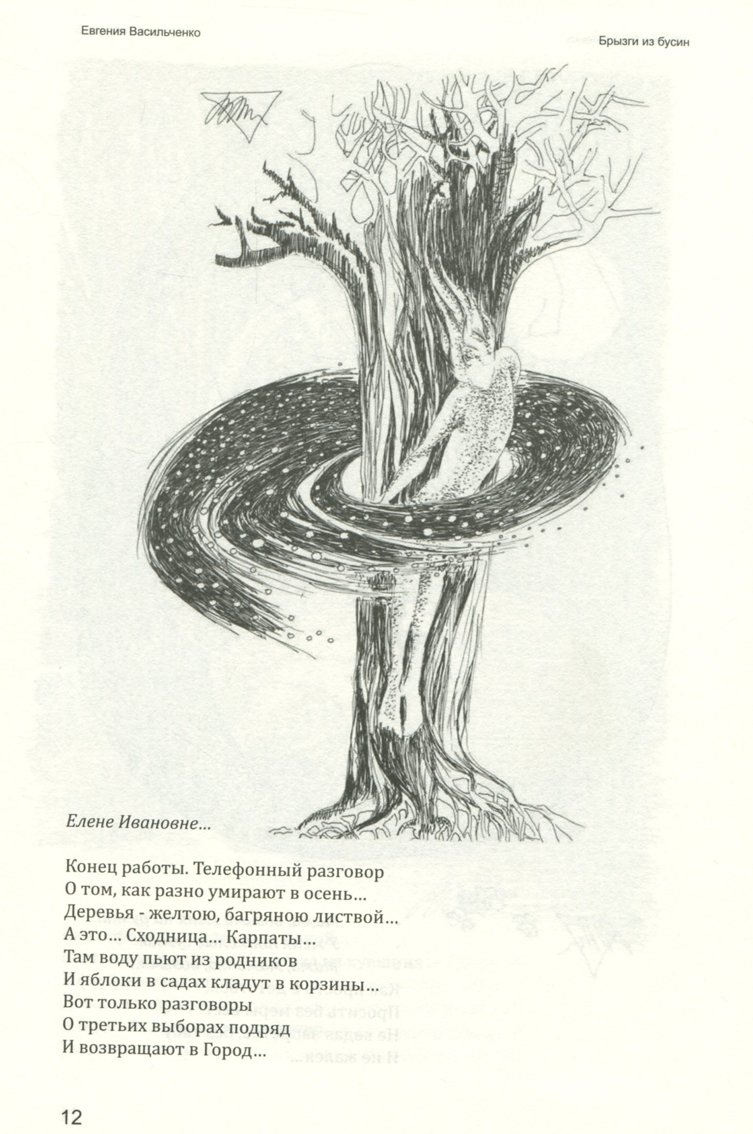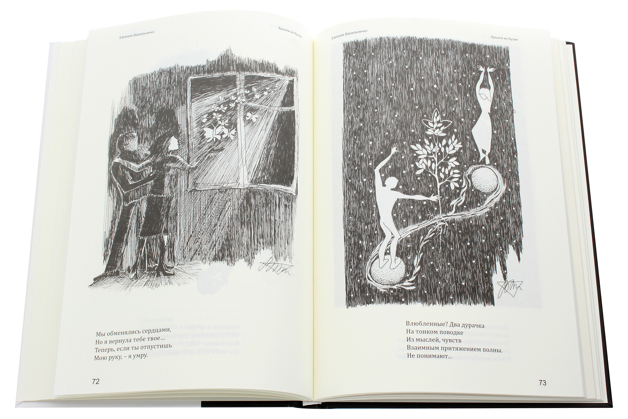 Свою графику Евгения Васильченко сопровождает белыми стихами. И хотя рисунки и стихи создавались независимо друг от друга, но, благодаря такому объединению, смысл творчества художницы выходит на новый уровень выразительности.